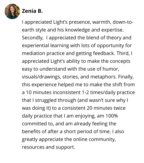 While most teachers tend to complicate the practice (which makes it more difficult to do), Light has mastered the art of making meditation simple and accessible for all. His teaching style is rooted in storytelling and analogies. And the trainings are extremely interactive, which increases the retention a thousand fold. You will be anything but bored in Light's dynamic training.